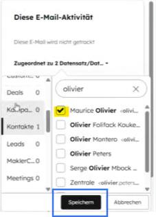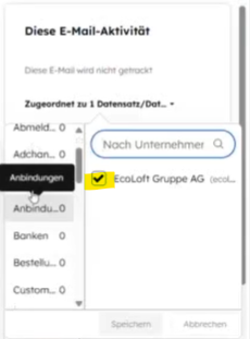 In diesem Beispiel wird die E-Mail dem Unternehmen "EcoLoft Gruppe AG" sowie dem Kontakt "Maurice Olivier" zugeordnet.