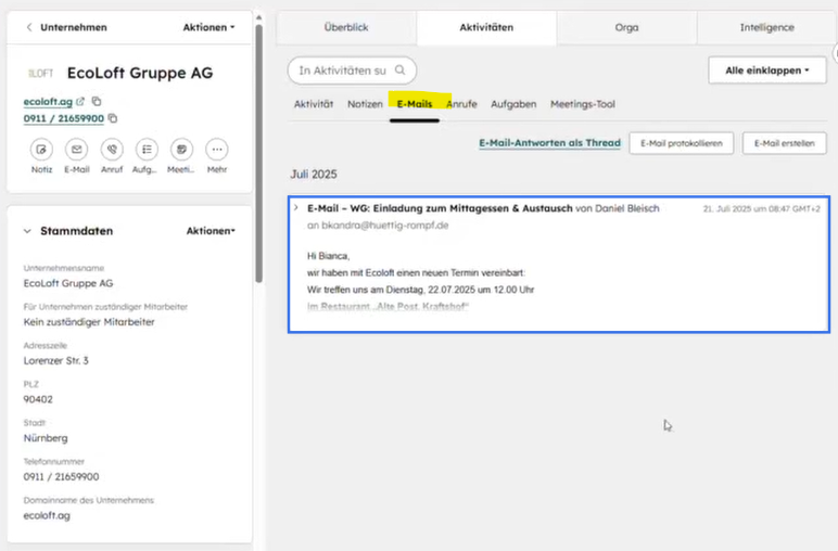 Anschließend wird dir die E-Mail in HubSpot angezeigt: