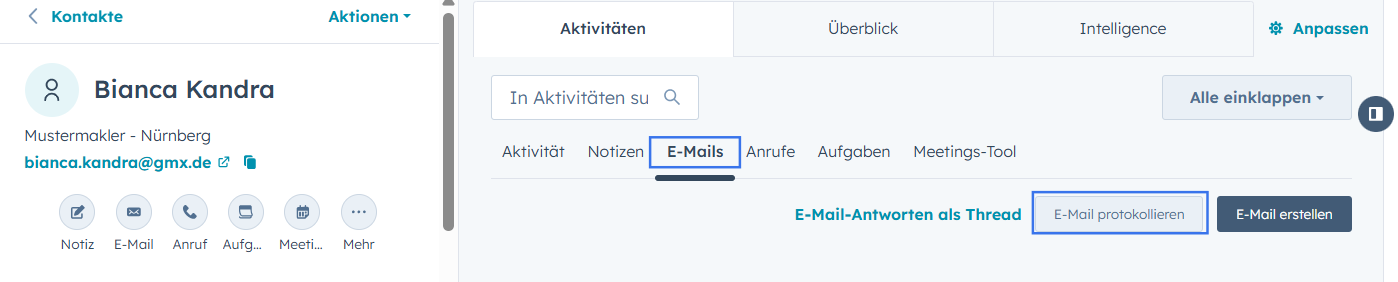 Sollte eine E-Mail nicht automatisch getrackt worden sein, hast du die Möglichkeit, diese manuell in HubSpot zu erfassen.