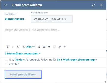 - In dem erscheinenden Pop-Up kannst du durch erfassen von Datum und Inhalt die E-Mail die relevanten Infos hinterlegen und mit Klick auf "E-Mail protokollieren" bestätigen.