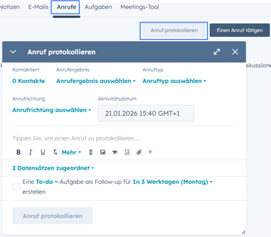 Für die vollständige Übersicht in HubSpot macht es Sinn, diese manuell zu protokollieren. Wähle dazu im Kontakt "Anrufe" > "Anruf protokollieren" aus: