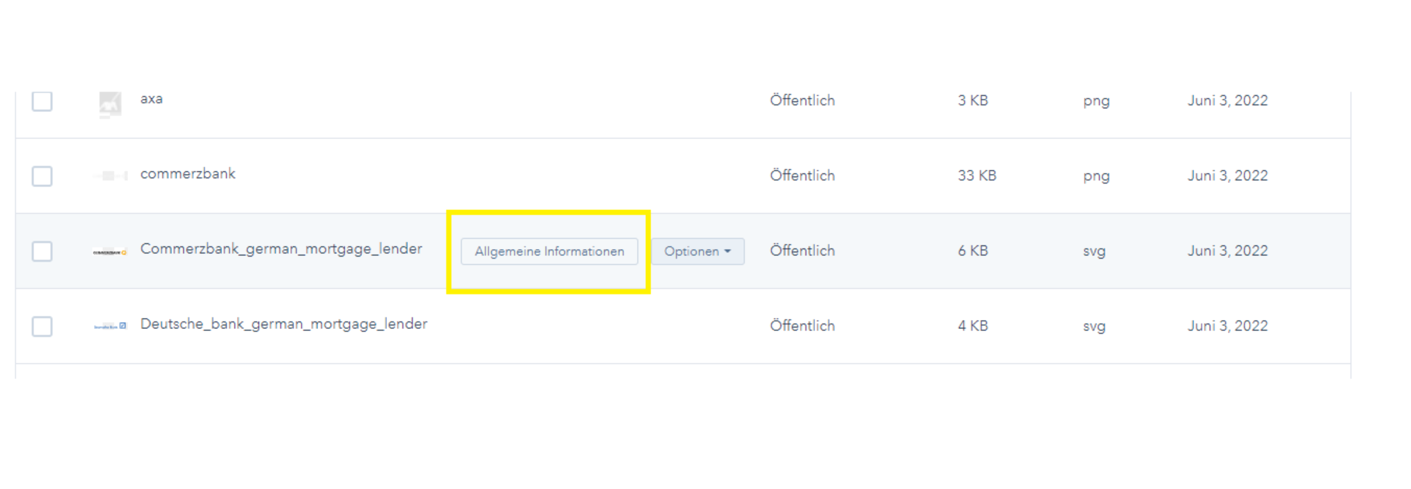4. Die URL zur externen Verwendung findet ihr indem ihr über das Asset hovert und Allgemeine Eigenschaften klickt, von dem ihr die URL benötigt.
