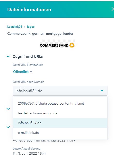 5. Alle Dateien haben eine eindeutige Datei-URL. Diese ist abhängig davon, ob man die kryptische Domain von HubSpot oder eine der von uns verknüpften Domains wählt. Aktuell haben wir folgende Domains: