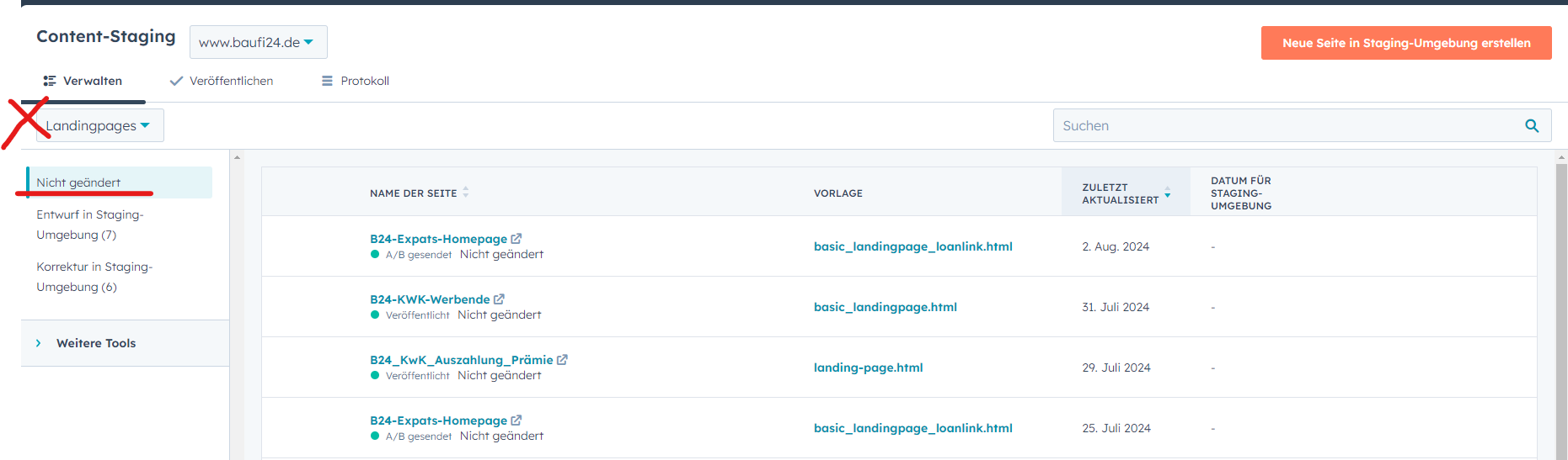 2. Unter Landingpages "nicht geändert" die zu überführende Landingpage auswählen "In Staging-Umgebung bereitstellen"